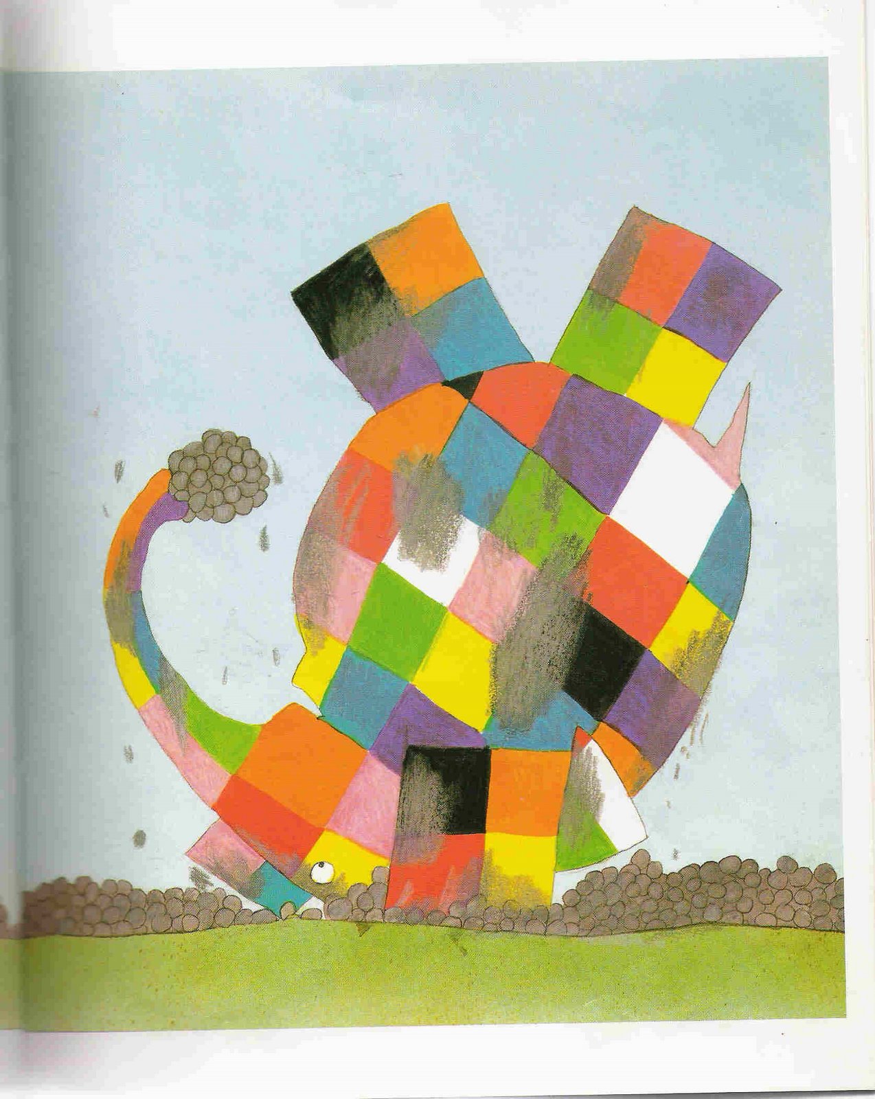 Cuando el suelo quedó cubierto de frutos, Elmer se tiró encima de ellos y se revolvió una vez y otra, de un lado y del otro, hasta que no quedó ni rastro de amarillo, de naranja, de rojo, de rosa, de morado, de azul, de verde, de negro o de blanco. Cuando terminó de revolcarse, Elmer era igual que cualquier otro elefante.